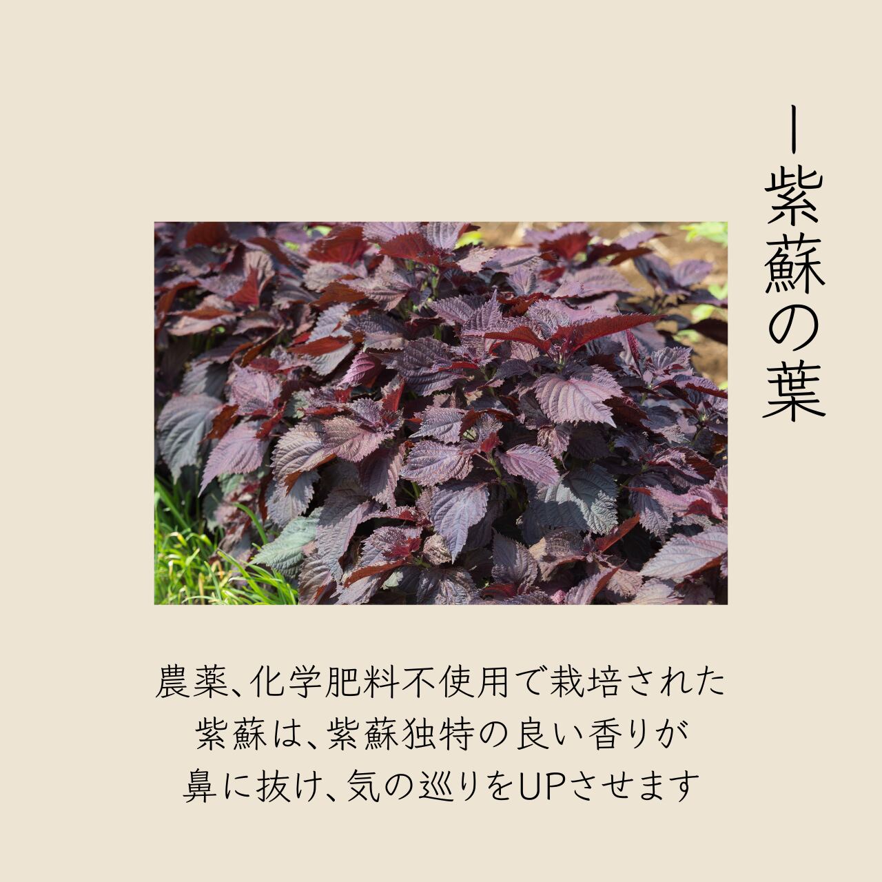 ○紫蘇の葉・・・農薬、化学肥料不使用で栽培された紫蘇は、紫蘇独特のいい香りが鼻に抜け気の巡りをサポートします。